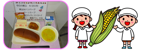 今日の給食では、甘味種の粒の冷凍品とすりつぶしてペースト状にしたものをコーンスープの具材として使用しています。