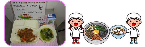 今日の給食では、ビビンバとトック合わせて、韓国・朝鮮風の献立にしています。