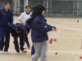 体育大会の学年練習で学年種目の練習をしています。 生徒持っている玉をかごに入れら...