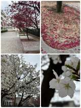 ●紅白の桜 紅い寒緋桜でしょうか、少しずつ落下しています。他の桜と違って、花び...