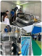 プールの工事が完了しました。濾過機や施設の説明を聞き、プール開きの準備をしました...