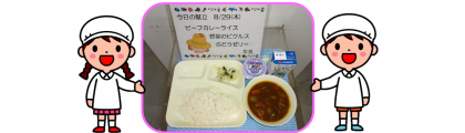献立名 ・ビーフカレーライス ・野菜のピクルス ・ぶどうゼリー ...