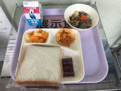 食パン 牛乳 鶏肉と野菜のスープ 変わりピザ ミックスフルーツ缶です。