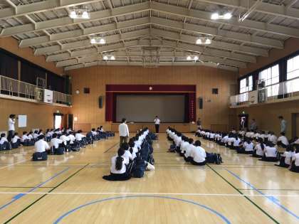 5月23日(木)朝、子どもたちは待ちに待った修学旅行へ出発をします。今、修学旅行に向けて出発式を行っています。