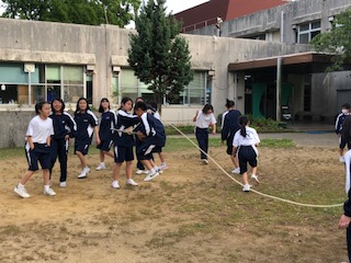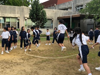 入所式を終え、荷物を各部屋に置いた子どもたちは、フリスピーディスク、大縄跳びをクラスごとに行っています。
