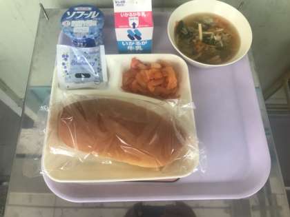 パン 牛乳 えびのチリソース 中華スープ ヨーグルト ブルーベリージャム