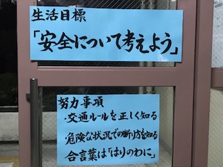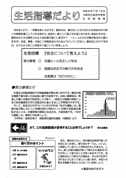 7月16日(火)学活時に子どもたちへ「生活指導だより」を配布しました。35日間の夏季休業においての生活目標を掲載しました。「安全について考えよう」という生活目標です。この長期休業を有意義な休みにしてほしいと考えます。保護者の方と一緒に生活指導だよりをご覧いただきまして「安全」について考えてみてください。
