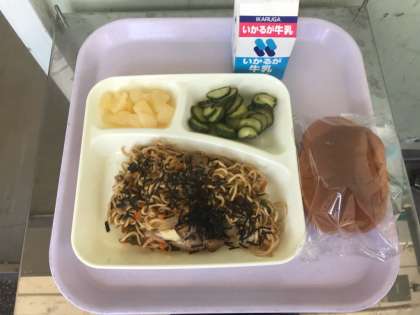 パン 牛乳 焼きそば きゅうりの甘酢づけ 洋なし
