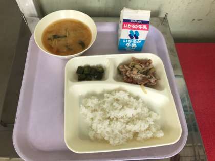 ごはん 牛乳 鶏肉の甘辛焼き みそ汁 オクラのおかかいため