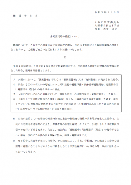 6日(金)に子どもたちに配布しました「非常変災時の措置について」のプリントを学校ホームページにも掲載しましたのでご確認ください。今後の災害についての対応はこの「非常変災時の措置ついて」に従って対応します。宜しくお願い申しあげます。