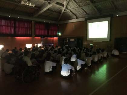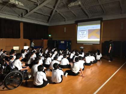 9月19日(木)の6時間目、1年生は格技室で福祉体験(車椅子・アイマスク体験)の事前指導を行いました。
