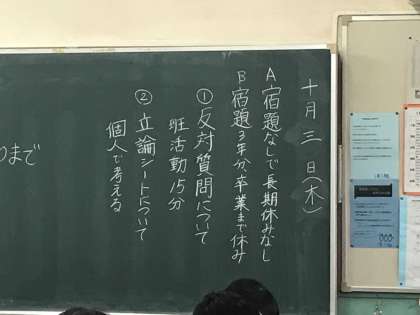 1年生の国語は「ディベート」の単元を学習しています。子どもたちからお題を出して各班でその題について話し合いました。