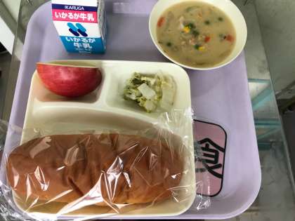 パン 牛乳 コーンクリームシチュー はくさいのピクルス りんご