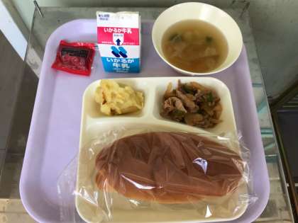 パン 牛乳 豚肉と野菜のケチャップソテー スープ スイートポテト いちごジャム