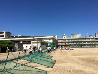 10月9日(水)、台風19号が日本に接近中の中、体育の授業後に3年1組・2組の子どもたちが防球ネットを倒して、台風に備えました。10日(木)、11日(金)と中間テストとなるため、早めの対応をしました。3年1組・2組のみなさん、ありがとうございました。
