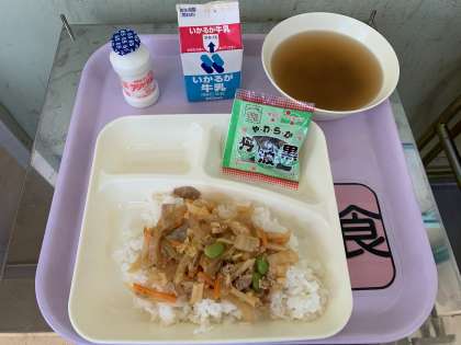 牛乳 ピリ辛丼 中華スープ ソフト黒豆 発酵乳