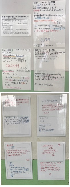 1年生の数学の時間では授業で出されたジャンプ課題について各班で取り組んだ内容と振り返りを1年生のフロアで掲示しています。子どもたちが日々、授業で取り組んでいる様子を学年のみんなで共有をしています。保護者のみなさまも中学校へお越しの際はぜひ、ご覧ください。