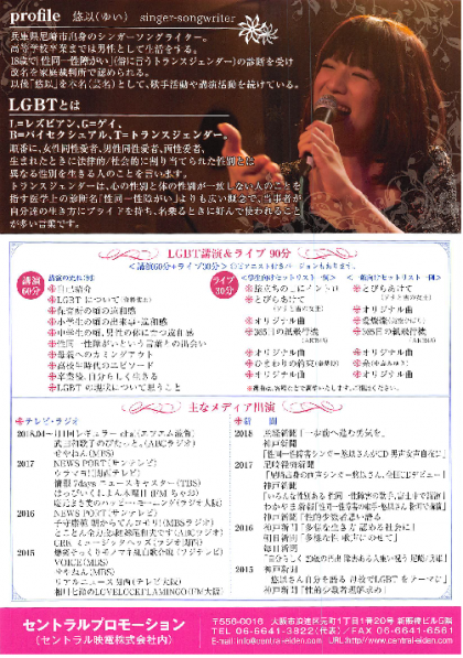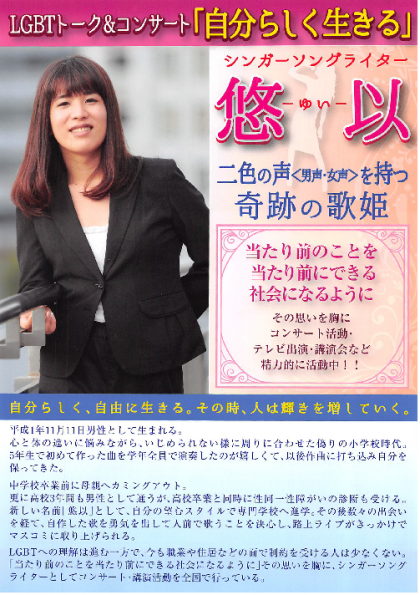 10月26日(土)の午前、シンガーソングライターの悠以さんをお招きしてLGBTトーク&コンサート「自分らしく生きる」を行います。