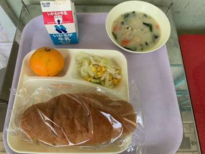 パン 牛乳 ほたて貝のクリームシチュー キャベツとコーンのサラダ みかん
