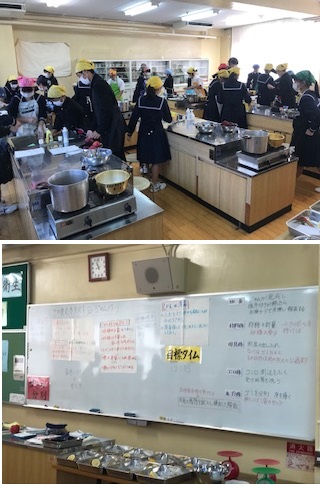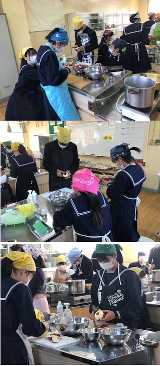 11月8日(金)3時間目、2年1組は調理室でりんごからジャムつくる調理実習を行いました。りんごの皮をむくテストも同時に行いました。美味しいジャムを製作中です。