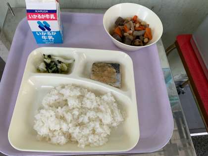 ごはん 牛乳 さごしのおろしじょうゆかけ 五目豆 こまつなとはくさいの甘酢あえ