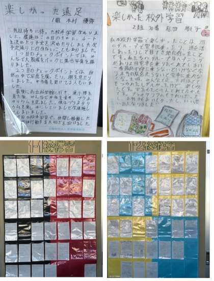 1年生の各教室前には、校外学習の振り返りとしてはがき新聞を掲示しています。子どもたちが校外学習を通じて感じたことや思ったことをはがきサイズの新聞に記載しました。