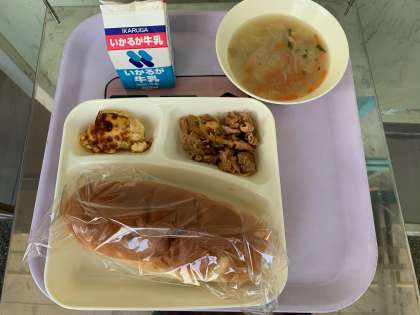 パン 牛乳 豚肉のケチャップソテー コーンスープ 焼きプリン
