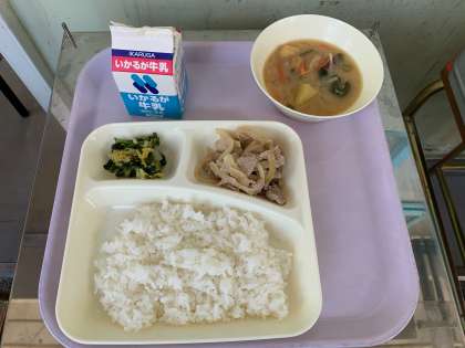 ごはん 牛乳 豚肉のしょうが焼き さつまいものみそ汁 きくなとはくさいのごまあえ