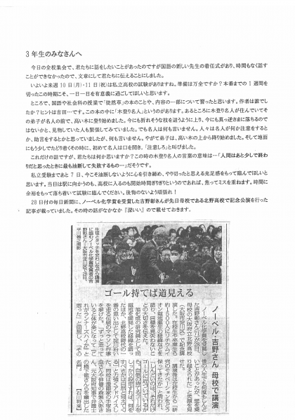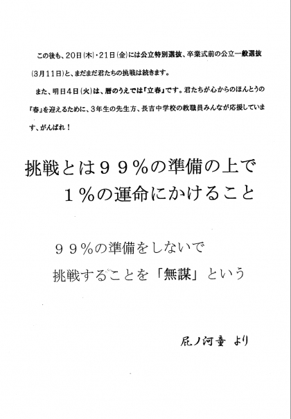 2月3日(月)の全校集会は新しく赴任される先生の紹介で子どもたちへお話ができませんでしたので、私立高校の入試を控える3年生に向けて校長先生から手紙が配られました。学校ホームページに掲載しますのでご覧ください。