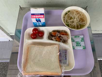 パン 牛乳 鶏肉とごぼうの煮もの なにわうどん プチトマト ブルーベリージャム