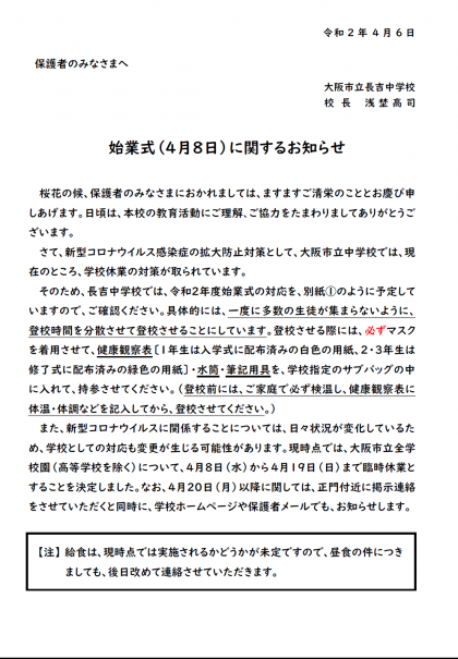 始業式(4月8日)に関するお知らせ