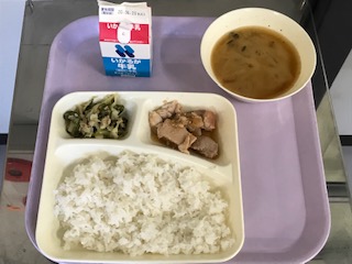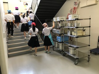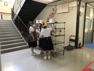 3年生の給食当番の子どもたちが食缶、牛乳、ごはんをとりに来ている様子です。