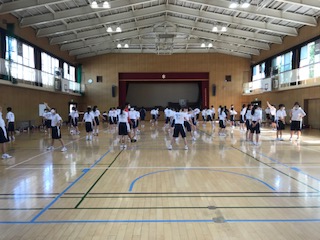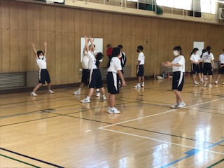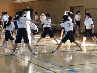 7月1日(水)〜22日(水)まで校内で相互授業参観週間を行います。教員がお互い授業を参観し合い、授業力の向上を目指します。7月2日(木)の7時間目に2年生の保健体育科の松井聖樹先生の授業が研究授業でした。子どもたちはグループで確かめながらラジオ体操に取り組んでいました。