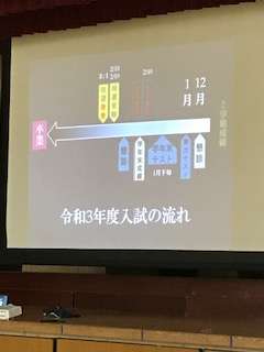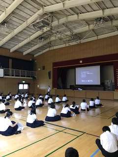 7月3日(金)の6時間目、体育館で3年生は進路学習を行いました。学校が再開して1カ月が過ぎました。3年生は自分の進路について考えていく時期になってきました。