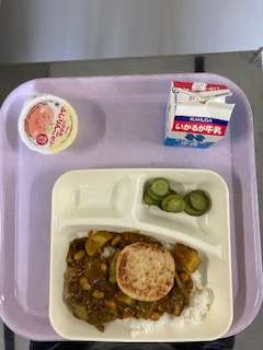 牛肉と大豆のカレーライス とうふハンバーグ きゅうりのピクルス りんごゼリー