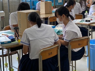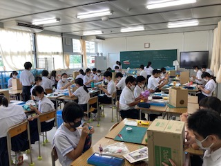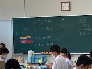 9月3日(木)の4時間目、2年1組の子どもたちは美術室で「ランプシェード」の作成に取り組みました。各グループで「作品完成」「ニスを塗る」「LED接着」「粘土」を意識して取り組みました。仕上がりが楽しみです。
