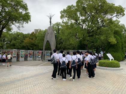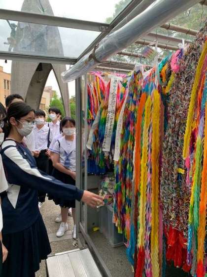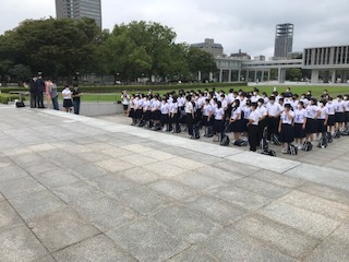 講話を聞いた後は、千羽鶴献納のために、国際会議場から、原爆死没者慰霊碑前に移動し、千羽鶴献納をしました。献納の前には、「平和への願い」をこめたセレモニーがおこなわれ、生徒代表による平和宣言(メッセージ)が述べられ、平和への思いを新たにすることができました。