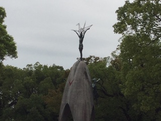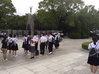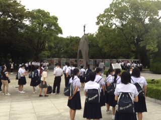 バスガイドさんの話を聞きながら、「原爆の子の像」や「原爆ドーム」を見ました。ドームを背景にして学級写真を撮影したり、生徒個々で、思い出となる写真をお互いに撮り合ったりしながら、時間を過ごしました。ほんの少し、雨がぱらつきましたが、ほとんど気にならない程度の雨でした。そして、バスに乗車し、安芸グランドホテル(広島県廿日市市)に向かいます。