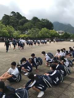 学級写真を撮るために、厳島神社近くに移動しています。観光客は、とても少ないです。