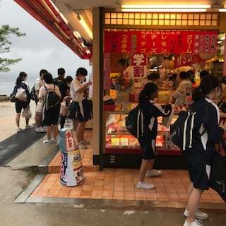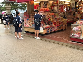 宮島でのお土産購入の時間が終わりました。全員そろってから、フェリーに乗ります。その後、バスで昼食場所へ移動します。