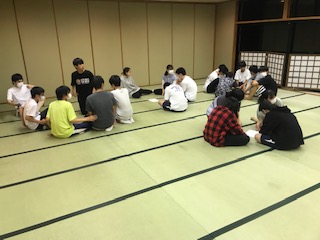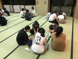 夕食を終えて、入浴・クラスミーティングの時間になりました。昨日同様に、クラスごとの入浴で、2組、3組、1組の順で、今日は入浴します。今日は、午前の宮島自由散策、午後のしまなみ海道サイクリング体験など、体を動かす活動が多かった一日でした。限られた時間ですが、温泉にゆっくりつかって、体の疲れをとってもらいたいですね。入浴していない時間帯は学級ごとで、クラスミーティングです。担任の先生のオリジナリティあふれる企画に、クラスが少しずつ一つにまとまっていっているような気がします。1組のクラスミーティングの様子です。