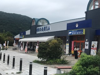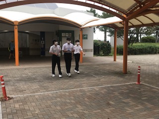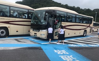 午後2時ごろに、津田の松原SAに着き、トイレ休憩とバス車内の換気をしました。バス乗車前には、消毒も常にしています。
