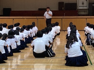 1・2年生のみんな、今、しっかりと考えて欲しい。3年生の修学旅行は1年生からの積み重ねで素晴らしい学びとしました。先生方は1年の間で君たちをこのように育てたい、伸ばしたいと思い、計画をたてて取り組んでいます。日々の学校生活をしっかりと取り組んでほしい。ルールをしっかり守ってマナーを磨き上げてほしい。」
