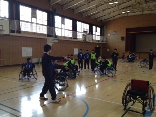 本日は大阪体育大学の学生さんに来校していただき、車いすハンドボールを体験しました。