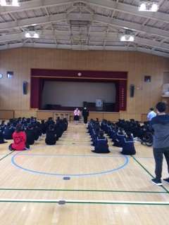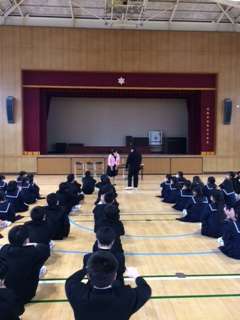 10月16日(金)6時間目、2年生は体育館で「ほめ達協会」の中田徳子先生をお招きしてマナー講習を行いました。下の写真はお辞儀の仕方の様子です。中田先生から教わったことを振り返り、日々の生活の中で人と接するマナーをわきまえてほしいと願っています。
