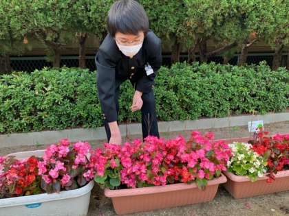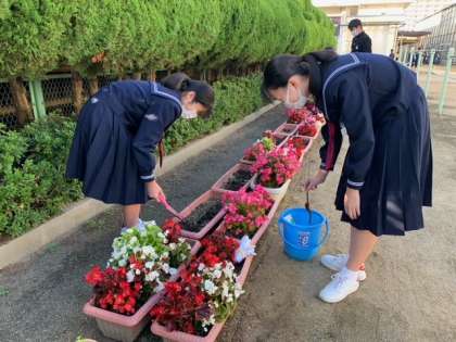 環境委員会では学校の緑化に向けて花の鉢植えを行いました。美しいお花がみんなを迎えてくれます。