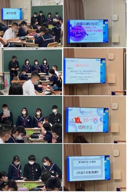 12月8日(火)の5時間目、3年2組の社会科の授業では公民的分野の選挙において模擬選挙を授業で行いました。各班で政党名を考え、公約を掲げ、演説を行い、投票する流れを授業の中で行いました。3年後に選挙権を持つことができます。社会の一員として選挙の大事さと有権者として貴重な一票を大切さを学ぶ貴重な1時間となりました。