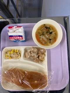 鶏肉のからあげ 中華みそスープ もやしとコーンの甘酢あえ