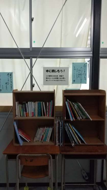 みんなが読んだ本を、学年フロア廊下に置いています。興味を持った本をぜひ読んでみてくださ