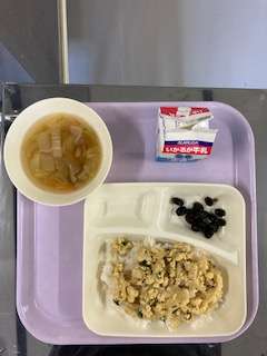 親子丼 すまし汁 黒豆の煮もの 牛乳